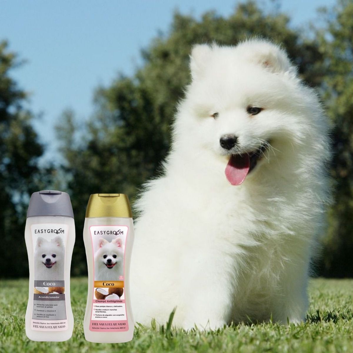 Acondicionador: es una crema cosmética veterinaria especial para acondicionar el pelo, suavizar los nudos y proteger el pelaje. Contiene aceite de coco ideal para cualquier tipo de pelaje. El aceite de coco se absorbe rápidamente por lo tanto no deja residuos grasos en el pelo. Ayuda a proteger el pelo de los efectos de los rayos solares. El acondicionador de coco Easygroom contiene removedores de suciedad, lubricá el pelo para que el nudo se pueda separar fácilmente y deja un agradable aroma.