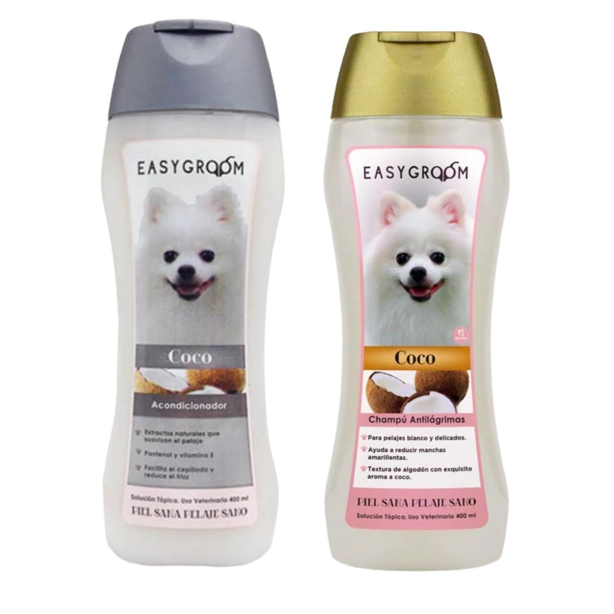Acondicionador: es una crema cosmética veterinaria especial para acondicionar el pelo, suavizar los nudos y proteger el pelaje. Contiene aceite de coco ideal para cualquier tipo de pelaje. El aceite de coco se absorbe rápidamente por lo tanto no deja residuos grasos en el pelo. Ayuda a proteger el pelo de los efectos de los rayos solares. El acondicionador de coco Easygroom contiene removedores de suciedad, lubricá el pelo para que el nudo se pueda separar fácilmente y deja un agradable aroma.