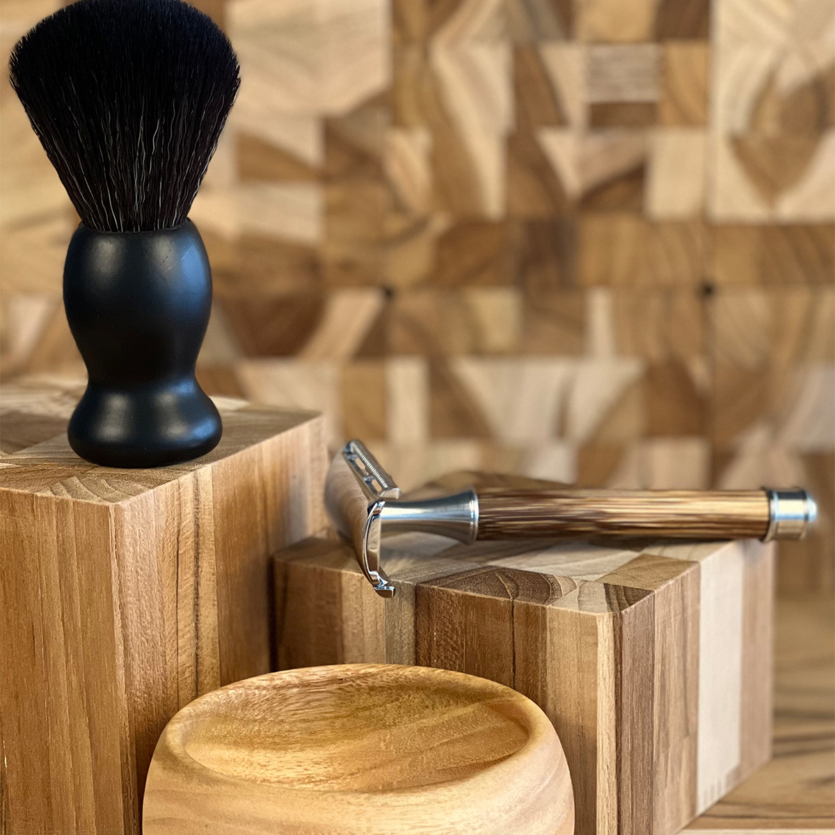 Este Kit Incluye: Kit Afeitadora de acero inoxidable con mango de madera que incluye 10 blades, Brocha y Tarrito de madera.