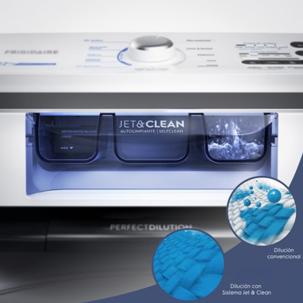 Por otro lado, gracias a la tecnología Jet&Clean, el detergente y el suavizante se diluyen completamente en la ropa, evitando manchas y manteniendo el dispensador siempre limpio. Asimismo, su doble enjuague asegura menos residuos de jabón y una limpieza más eficiente. También cuenta con un filtro atrapa pelusas, que facilita el lavado al retener las pelusas que podrían dañar la ropa, garantizando un resultado más limpio.