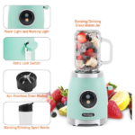 Además, esta licuadora incluye dos opciones de mezcla: un tarro de vidrio de 17 oz perfecto para disfrutar en casa, y una botella deportiva de 20 oz con tapa de viaje para llevar tus bebidas contigo mientras te desplazas. Con su interruptor de pulso de un solo toque, mezclar tus ingredientes es tan fácil como presionar un botón. También cuenta con mecanismos de seguridad que garantizan que la licuadora solo funcione cuando las tazas están correctamente colocadas.