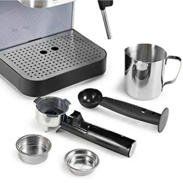 También incluye una boquilla de vapor de acero inoxidable y un vaso para espumar, perfectos para hacer capuchinos y cafés con leche en casa. Además, la bandeja de goteo extraíble y el portafiltros con mecanismo de bloqueo facilitan la limpieza después de cada uso. Incluso, la bandeja superior sirve para mantener calientes las tazas, así tu bebida siempre estará lista para disfrutar.