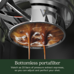 Luego, su sistema de 20 bares logra una extracción equilibrada y constante. Asimismo, el apisonador asistido forma un disco parejo, así que el café fluye de manera uniforme. De igual forma, el portafiltro sin fondo de 54 mm ayuda a obtener una crema más rica y visible.