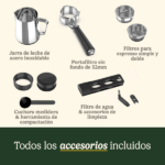 - Accesorios incluidos: jarra de leche, filtros, cuchara, prensador.