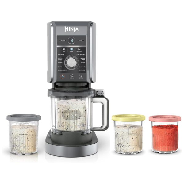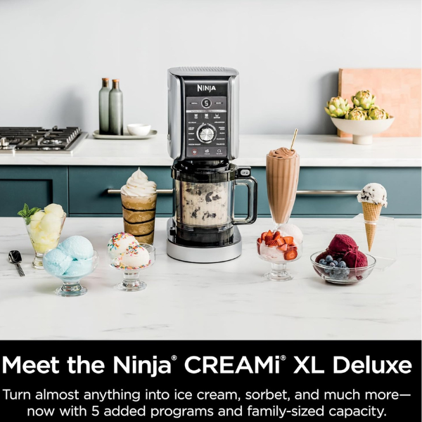 Por otro lado, esta máquina incluye todo lo que necesitas: la base del motor con doble accionamiento, la paleta Deluxe Creamerizer, cuatro tinas XL de 24 oz con tapas, un cuenco exterior con tapa y una guía de recetas para inspirarte. De hecho, cuenta con 5 programas adicionales que permiten desbloquear diferentes tipos de golosinas congeladas y experimentar con nuevos sabores.