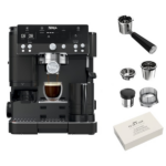 - Incluye: Portafiltro, jarra de leche, cesta doble, cesta de lujo, manipulación asistida, cepillo de limpieza, disco de limpieza, embudo, polvo descalcificante, tabletas de limpieza, kit de prueba de agua dura, instrucciones e guía de inspiración.