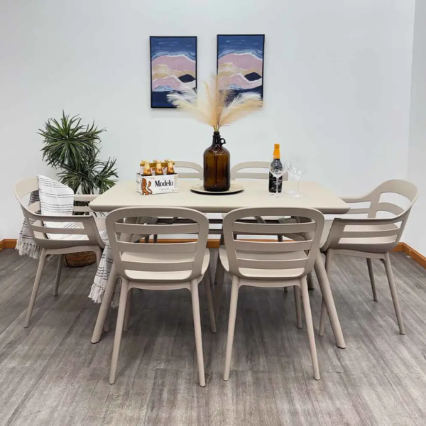 La EX-7175 ofrece espacio suficiente para hasta seis personas, lo que la hace perfecta para reuniones familiares, comidas al aire libre o uso comercial. Además, su superficie amplia permite colocar vajilla, utensilios o decoraciones sin problemas. Igualmente, su diseño neutro y sobrio combina con estilos modernos, minimalistas, rústicos o escandinavos, tanto en interiores como exteriores.