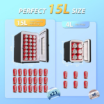 El mini refrigerador Cormix 15L es ideal para mantener tus bebidas y alimentos frescos en cualquier lugar. Además, con un tamaño compacto de 20″ de alto, 15″ de ancho y 20″ de profundidad, se adapta fácilmente a dormitorios, oficinas, viajes en automóvil o incluso camping. Por lo tanto, su capacidad de 15 litros permite guardar hasta 21 latas de 355 ml sin dificultad. También cuenta con un asa portátil que facilita su transporte.