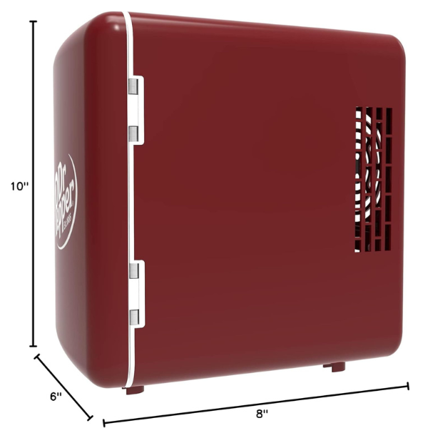 El Mini Refrigerador Curtis Dr. Pepper MIS135 de 4 litros es una opción práctica y llamativa para uso personal. Gracias a su diseño compacto y portátil, se adapta fácilmente a escritorios, mesas de noche o estantes pequeños. Además, su color granate aporta un estilo moderno, mientras que su tamaño reducido permite colocarlo en casi cualquier espacio sin complicaciones.