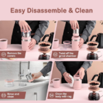 Con características de seguridad como protección para el motor y prevención de sobrecalentamiento, puedes confiar en su rendimiento sin preocupaciones. También incluye dos fundas para evitar derrames, lo que facilita el proceso de llenado y vertido. Además, su recipiente de moler extraíble es apto para lavavajillas, lo que facilita aún más la limpieza.