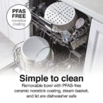 La limpieza es sencilla y rápida. El recipiente antiadherente de cerámica sin PFAS, la vaporera y la tapa son aptos para lavavajillas. Por último, cuenta con garantía limitada de 3 años, lo que brinda mayor confianza y durabilidad.