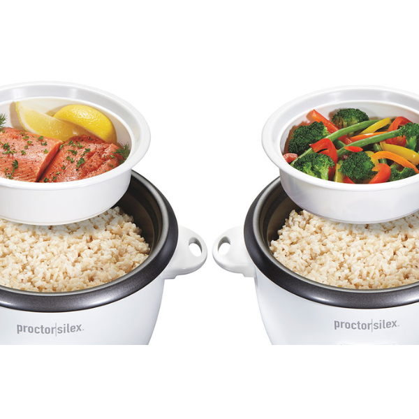 También es muy versátil, porque cocina arroz, quinoa, avena y otros granos. Además, incluye una canasta vaporera que funciona como colador, por lo que puedes lavar verduras y luego cocinarlas al vapor. Incluso puedes preparar pescado y vegetales al mismo tiempo que el arroz.