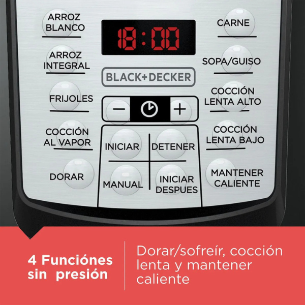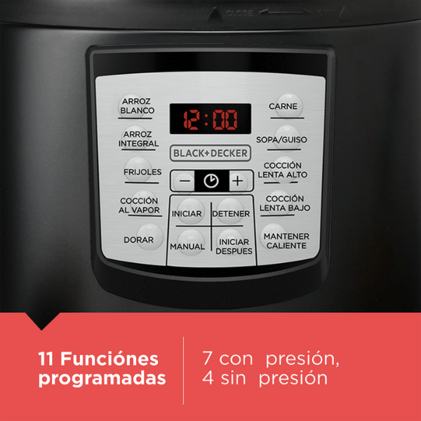 La Olla Multifunción Black+Decker de 5.7 litros PR100B es el aliado perfecto para preparar comidas deliciosas y saludables todos los días. Además, gracias a sus 7 funciones de presión, puedes cocinar arroz, frijoles, carnes, sopas y guisos de manera rápida y sencilla. Incluso su gran capacidad te permite preparar porciones para toda la familia sin complicaciones.