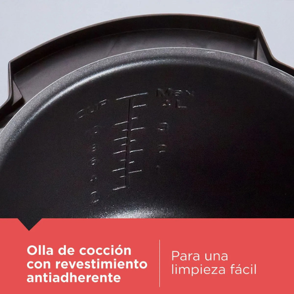 La olla interior con revestimiento antiadherente, además, facilita la limpieza y evita que los alimentos se peguen. Sumado a esto, sus 9 sistemas de seguridad independientes garantizan un uso seguro y confiable en todo momento, brindándote tranquilidad mientras cocinas.