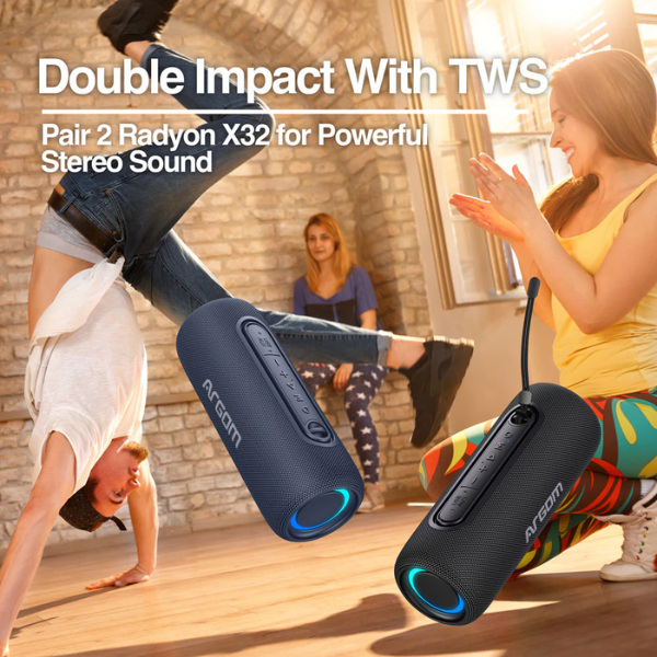 El RADYON X32 incluye la función True Wireless Stereo (TWS), que permite conectar dos parlantes de forma inalámbrica. Por consiguiente, se obtiene un sonido estéreo más envolvente y potente. Asimismo, su resistencia al agua y al polvo con certificación IPX5 lo hace ideal para usar al aire libre, sin preocuparte por salpicaduras o polvo.