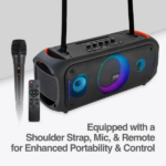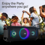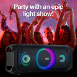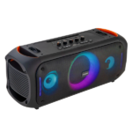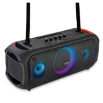 Por otro lado, este parlante no solo destaca por su sonido, sino también por su diseño visual. Cuenta con cuatro espectáculos de luces multicolores que se sincronizan al ritmo de la música, creando así un ambiente vibrante y divertido. En consecuencia, cada fiesta se transforma en una experiencia única tanto para escuchar como para ver.