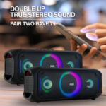 Finalmente, este parlante incluye control remoto, entradas USB, tarjeta TF y conexión Bluetooth 5.3 con un alcance de más de 10 metros. Del mismo modo, cuenta con la función TWS para enlazar dos parlantes y lograr un sonido estéreo más potente. En resumen, con el Rave 75 tendrás potencia, estilo y portabilidad en un solo dispositivo, listo para animar cada ocasión especial.