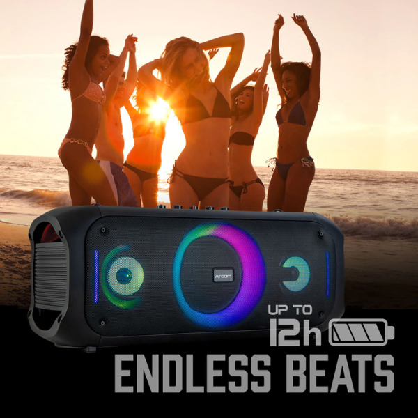 Asimismo, para mayor diversión, el ArgomTech Rave 75 incluye un micrófono con cable y dos entradas adicionales para micrófonos, lo que lo convierte en la elección ideal para noches de karaoke. Igualmente, ofrece una ranura para colocar tu tableta o teléfono, lo que facilita la reproducción de listas de canciones o videos. Gracias a sus asas de agarre rápido, transportarlo a cualquier lugar resulta muy sencillo.