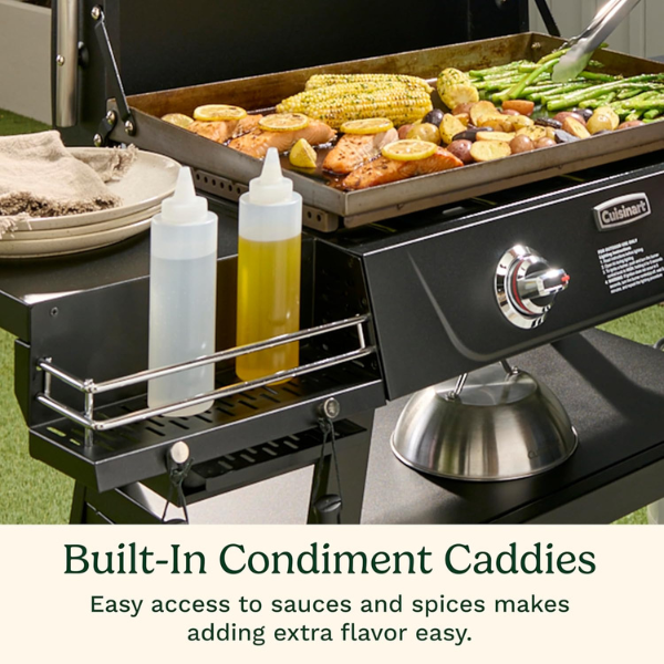 La Parrilla Cuisinart de 28 pulgadas con tapa CGG-9748 es perfecta para quienes disfrutan cocinar al aire libre con comodidad y potencia. Con una superficie de cocción plana de acero al carbono de 504 pulgadas cuadradas, permite preparar hasta 24 hamburguesas a la vez, ideal para reuniones familiares o con amigos. Además, su tapa integrada ayuda a conservar el calor y acelerar la cocción.