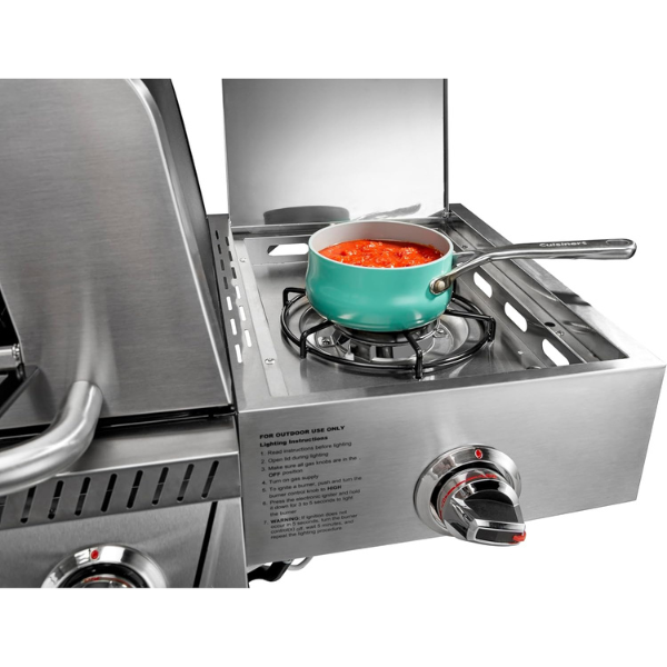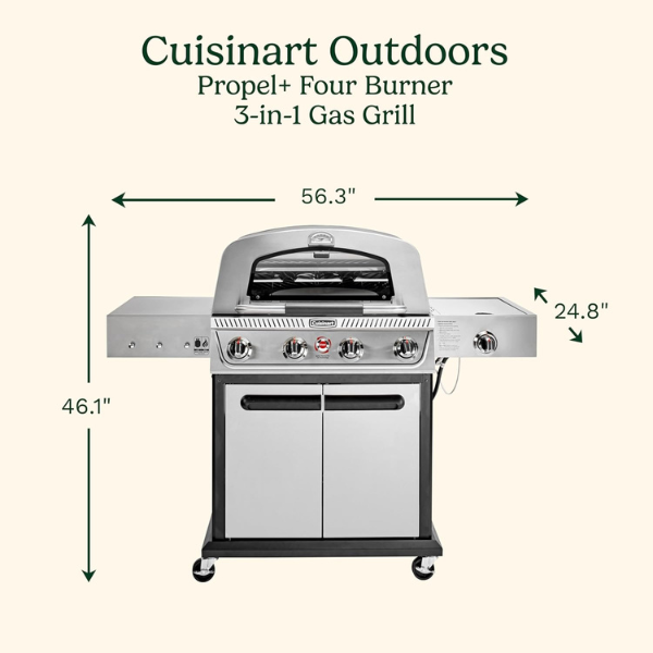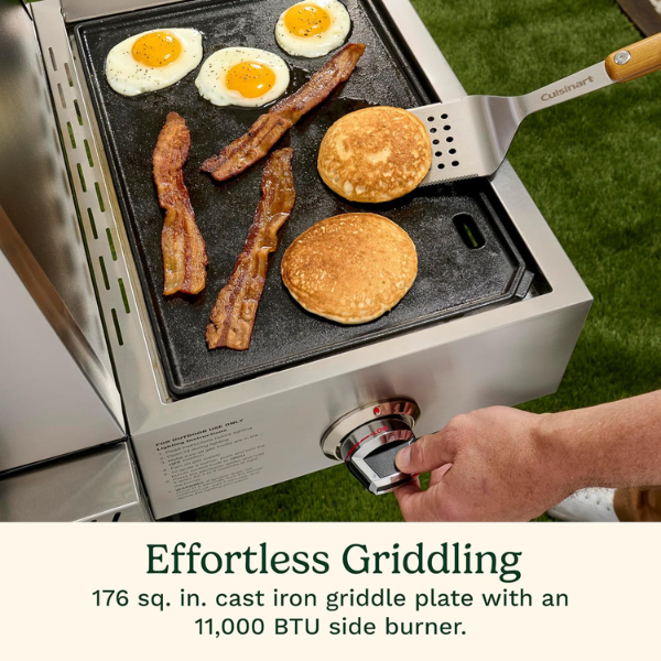 La parrilla de gas Cuisinart 3 en 1 CGG-6331 está diseñada para quienes disfrutan cocinar al aire libre con versatilidad y potencia. Con ella, puedes asar, dorar o preparar deliciosas pizzas, ya que cuenta con una amplia superficie de cocción de 477 pulgadas cuadradas, una plancha de 176 pulgadas cuadradas y una piedra para pizza de 15 pulgadas.