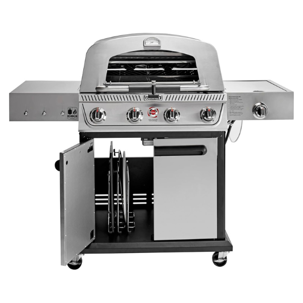 Por otro lado, su potencia de 44 000 BTU distribuidos en cuatro quemadores, más una plancha de 11 000 BTU, ofrece un rendimiento comparable al de parrillas profesionales. Asimismo, la plancha de hierro fundido alcanza los 288 °C (550 °F), ideal para sellar carnes con calidad de restaurante.