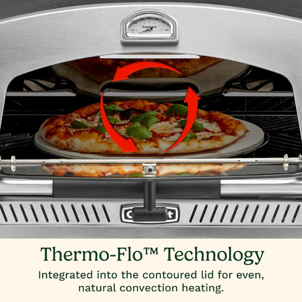 Además, incluye una piedra de cordierita que distribuye el calor de forma uniforme, logrando pizzas con una corteza crujiente en menos de seis minutos. Su puerta de vidrio templado abatible ayuda a mantener la temperatura ideal, mientras que el sistema Thermo-Flo garantiza un calor constante de borde a borde para resultados siempre perfectos.