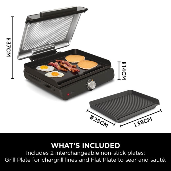 Por otro lado, con la placa de parrilla obtendrás resultados dorados y jugosos, ideales para carnes, verduras o incluso queso halloumi. En cambio, si prefieres algo más versátil, la placa plana es perfecta para cocinar huevos, tocino, fajitas, panqueques o tostadas francesas. Además, gracias a su superficie antiadherente, puedes cocinar usando poco o nada de aceite, lo que permite disfrutar de comidas más saludables sin perder sabor ni textura.