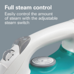 Finalmente, el control de vapor es completamente ajustable, lo que te permite seleccionar la cantidad exacta de vapor para cada tipo de tela. Además, el tanque de agua cuenta con una ventana visible, lo que facilita verificar el nivel de agua y asegurarte de que no falte durante el proceso.