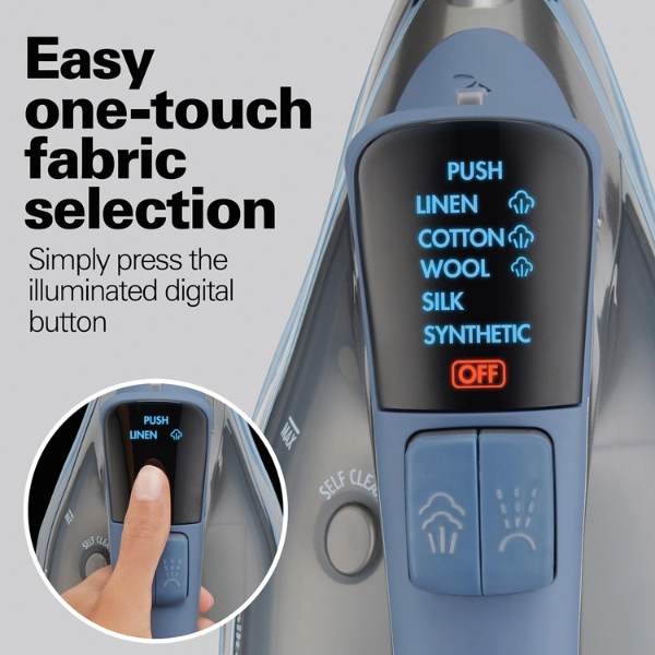 Por otro lado, el botón digital de un toque permite seleccionar la temperatura adecuada según el tipo de tela de manera rápida y sencilla. Además, la plancha ofrece apagado automático de 3 vías, lo que brinda mayor seguridad si se olvida encendida. Igualmente, la función antigoteo evita derrames de agua mientras planchas, manteniendo la ropa limpia y seca.