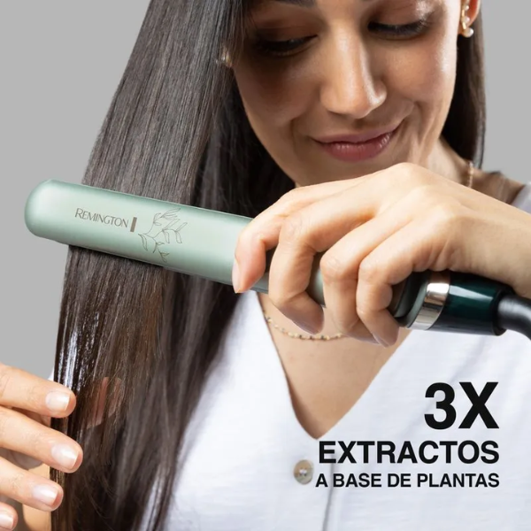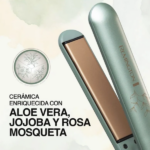 La plancha Remington Botanicals S32A-110F es ideal para cuidar tu cabello mientras lo alisas. En primer lugar, cuenta con placas de cerámica avanzada enriquecidas con aloe vera, jojoba y rosa mosqueta, ingredientes que ayudan a mantener el cabello suave y brillante. Gracias a este recubrimiento, el cabello queda 60% más saludable y protegido del daño.