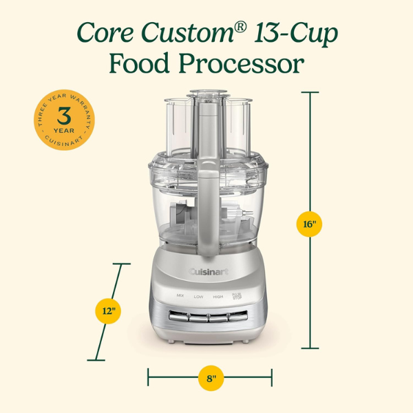 El procesador de alimentos Cuisinart Core Custom de 13 tazas está diseñado para ofrecer comodidad y eficiencia en cada preparación. Gracias a su nueva plataforma de motor, este equipo proporciona una potencia constante que permite realizar una gran variedad de tareas, desde picar vegetales hasta preparar masas. Además, su diseño contemporáneo aporta un toque elegante a cualquier cocina.