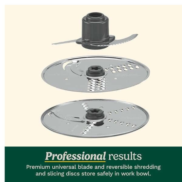 Asimismo, su cuchilla universal permite picar, mezclar y amasar, mientras que el disco reversible ofrece opciones de rallado y rebanado fino o mediano. Por otro lado, su tapa con sello y empujadores pequeños y medianos mejoran la seguridad y evitan derrames.
