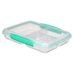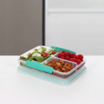 Por otro lado, incluye un compartimento grande y dos más pequeños que facilitan separar galletas, frutos secos, frutas o aperitivos. Gracias a esta distribución, es posible mantener cada alimento fresco y en buen estado hasta el momento de consumirlo. Asimismo, su formato es adecuado para quienes buscan orden y rapidez.