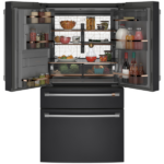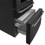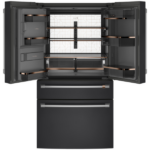 El refrigerador Café Energy Star CXE22DP3PD1 22.3 pies combina diseño moderno y eficiencia energética, por lo que se adapta a cualquier cocina. Además, su acabado en negro mate y puertas francesas le dan un aspecto elegante, mientras que la profundidad de mostrador permite una integración perfecta con los muebles. Por otra parte, sus manijas Café Pro en acero inoxidable y bisagras ocultas aportan estilo y funcionalidad.