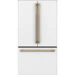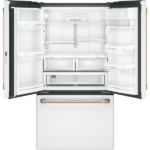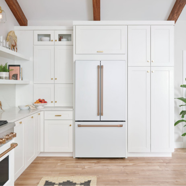 El refrigerador Café Energy Star CWE23SP4MW2 de23.1 pies, combina diseño moderno y eficiencia energética, además de ofrecer comodidad en el día a día. Su acabado en blanco mate y las puertas tipo francés con manijas CAFÉ en bronce cepillado le dan un aspecto elegante. Asimismo, su diseño counter-depth permite que se integre perfectamente con la cocina sin sobresalir. Por otro lado, las bisagras ocultas y los topes de puerta mejoran la funcionalidad y la durabilidad del equipo.