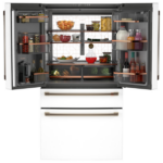 Este refrigerador Café CJE23DP4WW2 ofrece un diseño moderno en color blanco mate y, además, presenta puertas francesas con bordes contorneados. Asimismo, sus bisagras ocultas y sus manijas en bronce cepillado crean una apariencia limpia y elegante. Por lo tanto, se adapta bien a cocinas que buscan un estilo actual, mientras que su tamaño de encastre ayuda a lograr una línea uniforme.