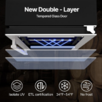El diseño es práctico y versátil. Por ejemplo, mide 22.4″ de profundidad, 14.8″ de ancho y 34″ de alto, lo que lo hace ideal para debajo de la barra, encimera o instalación independiente. Del mismo modo, la ventilación frontal facilita su colocación.