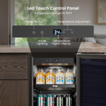 El control de temperatura es preciso y sencillo gracias a la pantalla digital. Concretamente, se puede ajustar entre 34 y 54 °F, y el sistema de descongelación automática garantiza que las bebidas se mantengan en óptimas condiciones. Además, la iluminación LED suave permite ver claramente su contenido, incluso en la oscuridad, lo que añade un toque moderno y práctico al refrigerador.