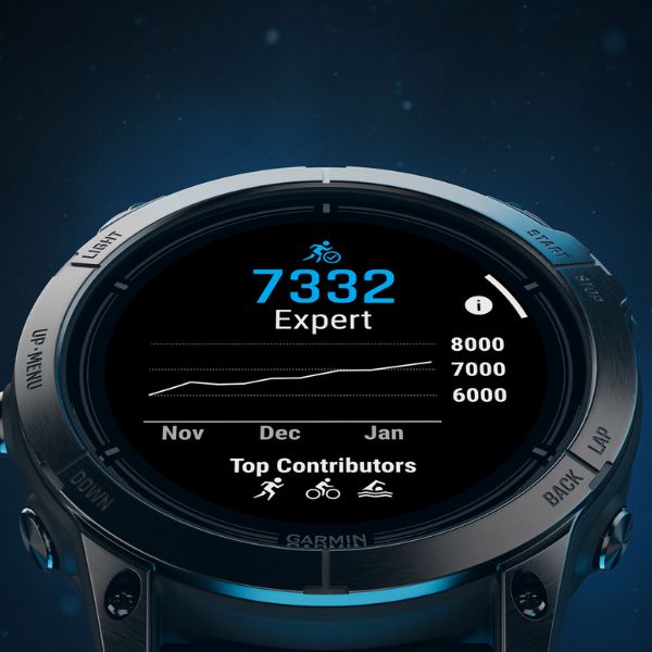 - Vigilancia de la salud: Frecuencia cardíaca, tasa de respiración, saturación de oxígeno, edad física, monitor de energía Body Battery, estrés de todo el día, recordatorios de relajación, y más.
