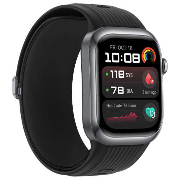 Asimismo, destaca su pantalla AMOLED de 1,82 pulgadas con resolución de 480 × 408 píxeles, que ofrece imágenes claras y brillantes. También incluye altavoz, micrófono, Bluetooth 5.2, NFC, corona giratoria y botón ECG, lo que facilita la conectividad y el manejo del reloj.