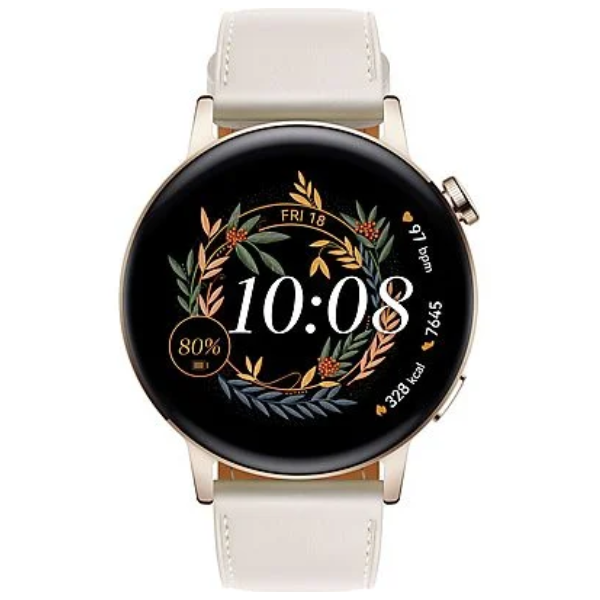 El diseño del Huawei Watch GT 3 es moderno y resistente. Por lo tanto, su caja redonda de 42 mm de acero inoxidable dorado combina perfectamente con la correa de cuero blanca ajustable. Además, es resistente al agua y al polvo, lo que significa que puedes usarlo mientras nadas o realizas actividades al aire libre sin problemas.