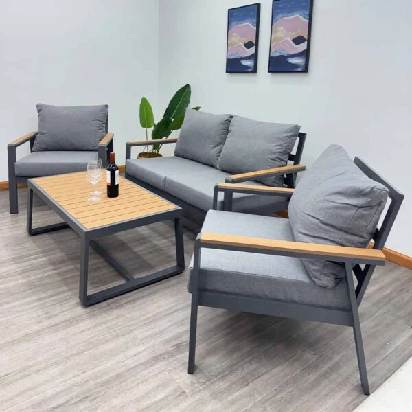 La sala exterior Tokoa EX-7182 es perfecta para disfrutar del aire libre con estilo y comodidad. Además, su diseño moderno combina elegancia y funcionalidad, lo que la hace ideal para terrazas, jardines o balcones. Por un lado, la estructura de aluminio proporciona ligereza y resistencia; por otro, la madera plástica y la tela sintética soportan la lluvia y la humedad, garantizando durabilidad.