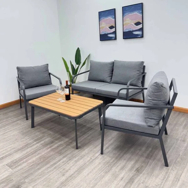 La sala Tokoa EX-7184 combina diseño, comodidad y resistencia. Además, su estructura de aluminio anticorrosivo con madera plástica y tela sintética impermeable asegura durabilidad incluso al aire libre. Por lo tanto, es ideal para terrazas, jardines y cualquier espacio que requiera estilo y resistencia. Así mismo, su color aluminio aporta un toque moderno que combina con cualquier decoración.