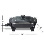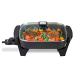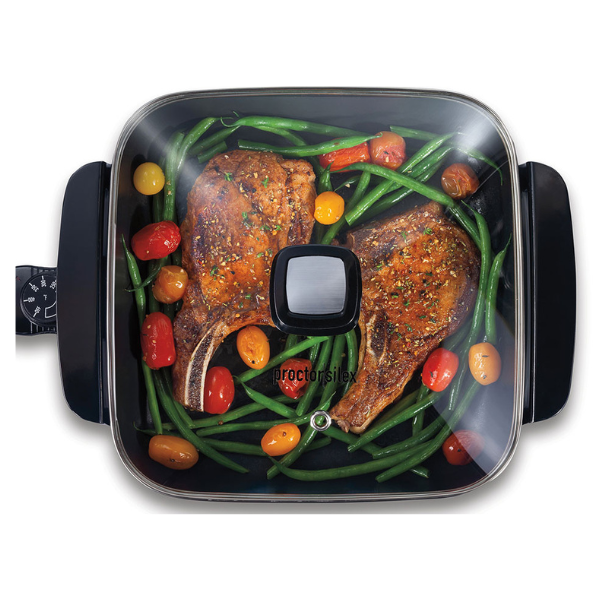 La Sartén Eléctrica Proctor Silex 38526MN de 12″ te permite preparar una gran variedad de comidas de manera rápida y cómoda. Además, gracias a sus 116 pulgadas cuadradas de superficie de cocción antiadherente, puedes freír, saltear, estofar o cocinar a fuego lento sin necesidad de usar otra sartén. Por ejemplo, ya sea tocino, sándwiches de queso o chuletas de cerdo, esta sartén se adapta a todas tus recetas favoritas.