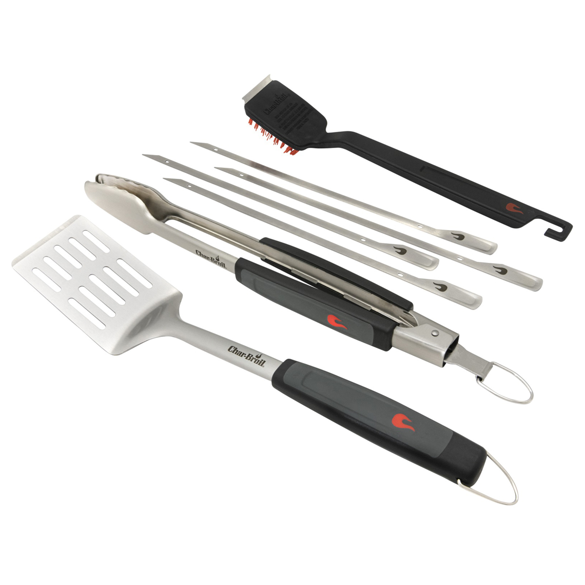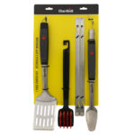 - Tiene: espátula, pinzas de bloqueo, cepillo para asar y cuatro brochetas.