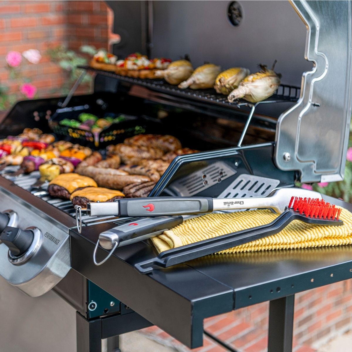 Las brochetas anchas mantienen la comida en su lugar hasta que estén listas para girar y el cepillo Safer, frota la parrilla sin temor a que las cerdas de metal extraviadas entren en contacto con los alimentos.