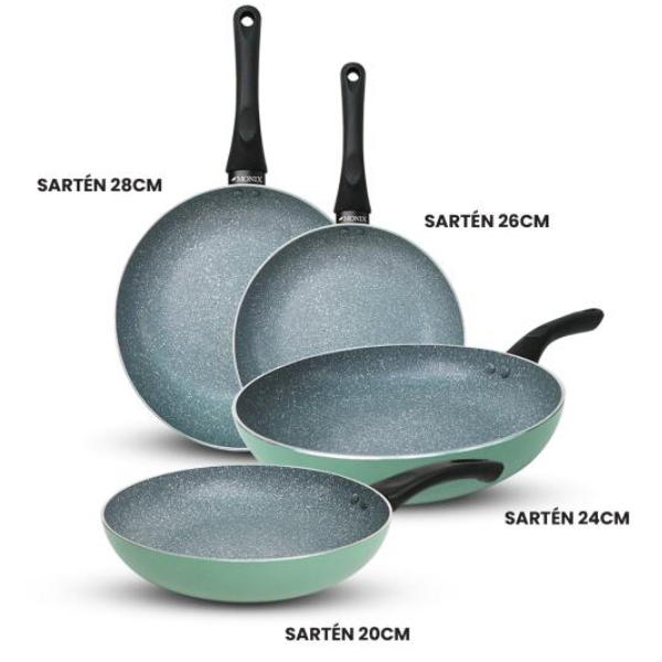 El set de sartenes Monix MCL-SS4-V de aluminio verde de 28 cm es una excelente opción para quienes buscan calidad, comodidad y estilo en la cocina. Además, gracias a su diseño moderno y funcional, permite preparar todo tipo de recetas de manera rápida y segura. Por lo tanto, es ideal para quienes desean cocinar con eficiencia sin renunciar a un toque decorativo, ya que su color verde combina perfectamente con cualquier cocina.