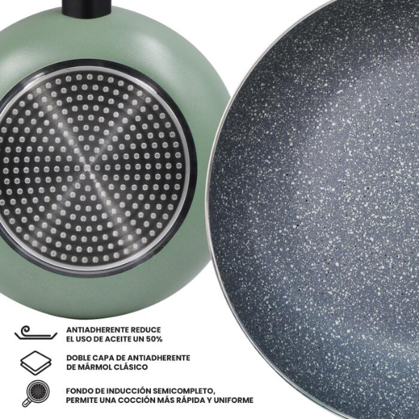 Por otro lado, estas sartenes cuentan con una doble capa de antiadherente de mármol clásico, lo que evita que los alimentos se peguen. De esta forma, la limpieza se vuelve mucho más sencilla y práctica. Asimismo, este recubrimiento mejora el desempeño y la durabilidad, lo que garantiza un uso prolongado y resultados excelentes en cada preparación.