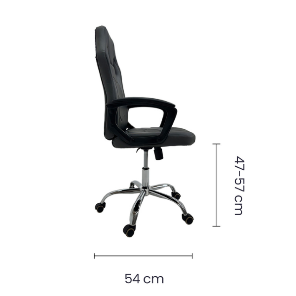 La silla está hecha con vinilo de alta calidad y una base de metal cromada de 32 cm, lo que garantiza durabilidad. Además, tiene respaldo y asiento reclinable con seguro y brazos cubiertos de vinilo, para ofrecer más confort. Gracias a esto, es posible jugar, estudiar o trabajar por horas sin molestias