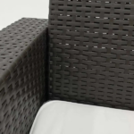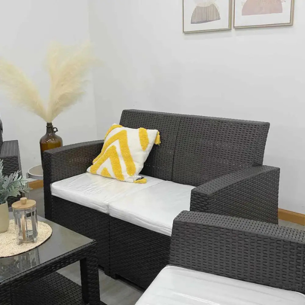 El sofá tiene un color café oscuro con textura tipo ratán que combina fácilmente con otros muebles y decoraciones. Además, está hecho de plástico resistente con protección UV, lo que asegura durabilidad, firmeza y estabilidad, incluso al usarlo en exteriores. En consecuencia, es un mueble confiable para cualquier ambiente.